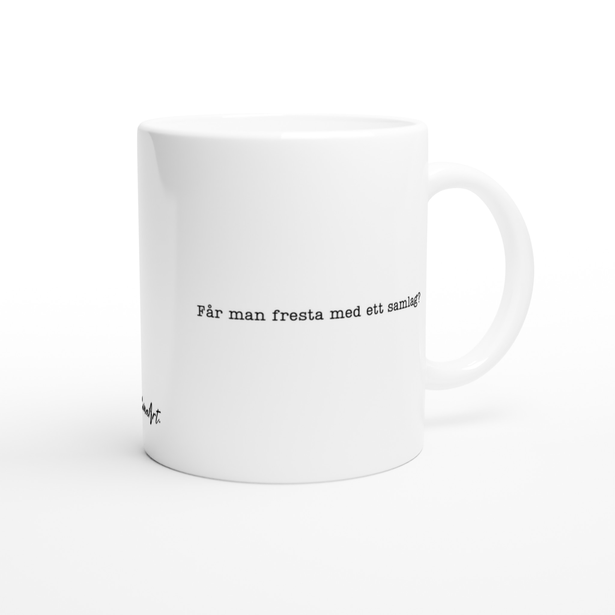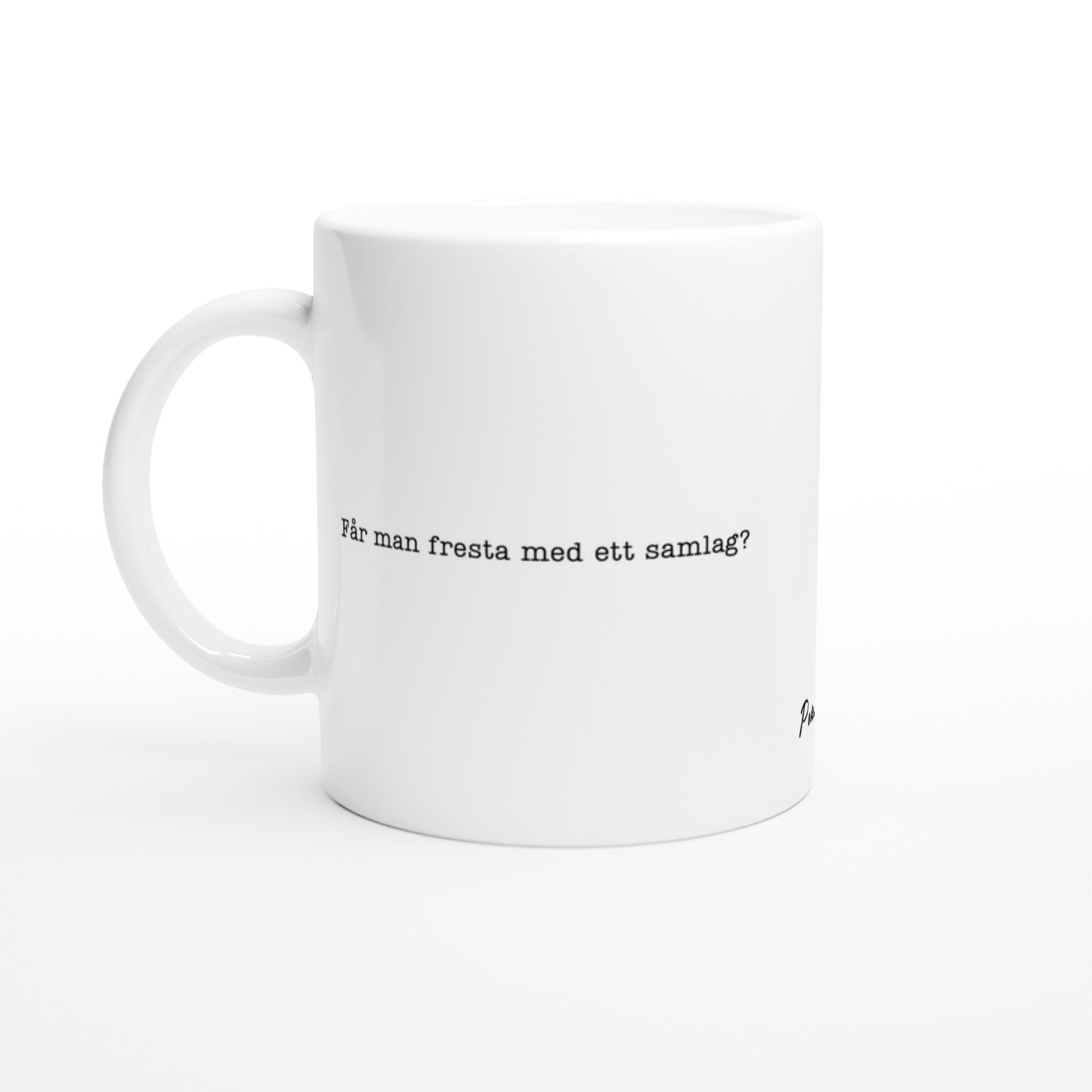 Är du en mästare på att bryta isen med en glimt i ögat? Då är denna mugg din nya bästa vän! Med det vågade och humoristiska trycket ”Får man fresta med ett samlag?” kommer du garanterat att väcka uppmärksamhet och skapa samtalsämnen. Denna mugg är perfekt för alla som uppskattar en dos av fräckhet och en förmåga att se det komiska i vardagens små flirtiga ögonblick.